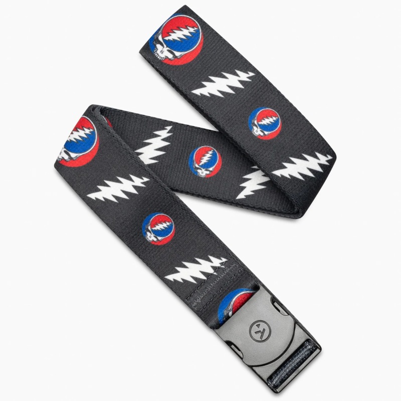 The Grateful Dead Steal Your Face Arcade Belt is one size fits all with a micro-adjustable belt buckle. Designed for adventure, it has no metal, making it easy to secure at airports.