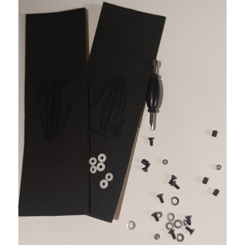 This CLOSE UP Fingerskate repair kit contains 2 rectangle quality rip tapes 35 mm wide, with a Skull Hand logo printed, 3 pairs of bushings, 8 screws, 2 sizes of metal washers, 6 silver or golden locking nuts for trucks, plus a multi tool to assemble and fix them.