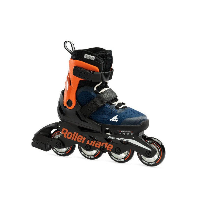High quality ROLLERBLADE Microblade Midnight Blue / Hot Orange adjustable children's skates, these skates are adjustable to four full sizes to fit growing feet. An easy-to-use system works with the push of a button and markers in the toe area align the skates to the correct size.