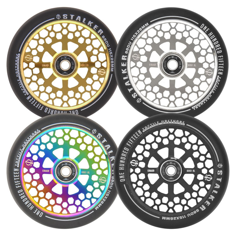 OATH Stalker freestyle scooter wheels in 115mm x 28mm, for better "grip" on the ground and wider turns at higher speed.