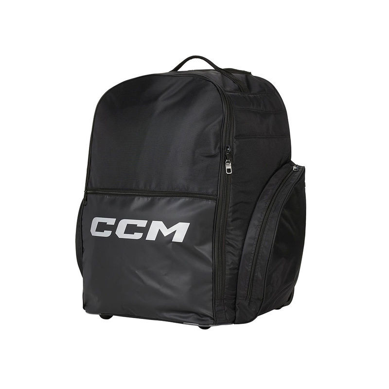 Le sac à dos à roulette CCM 490 senior 18" est fabriqué en bâche professionnelle résistante à l'eau et en polyester ripstop 840D avec renfort en tissu de bâche sur le fond. Il possède deux bretelles de sac à dos rembourrées et renforcées avec une fente pour porte-bâtons, ainsi qu'un compartiment principal avec des poches pour les skates et une poche pour accessoires à l'avant. Les roues tout-terrain facilitent le transport de votre équipement.