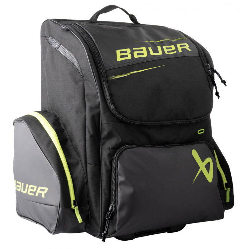 Ce sac à dos Bauer à roulettes pour équipement de hockey sur glace est conçu pour répondre aux besoins des joueurs en offrant un espace de rangement optimal et une grande facilité de transport.