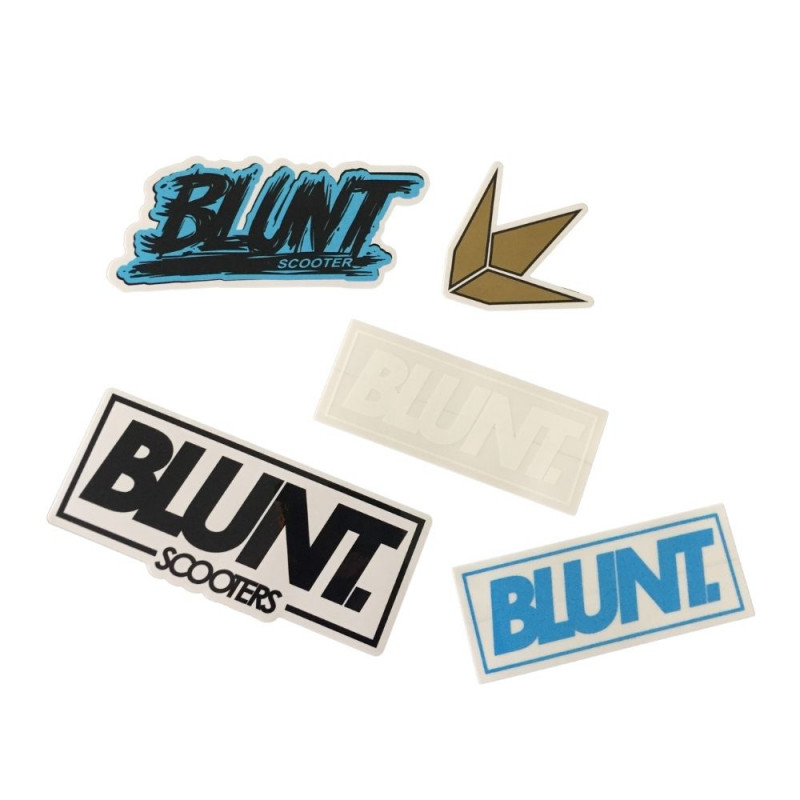 Pack de 5 stickers autocollants de la marque de trottinette freestyle BLUNT Scooter. Taille : 9cm x 4cm maximum