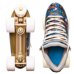 Nouveau roller quad IMPALA Harmony Blue habillé d’un imprimé inédit « Harmony » est doté de trucks et de broderies dorées.