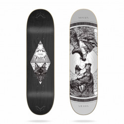 Planche de skateboard SOVRN Geri & Freki en 8", une planche au graphisme hyper travaillé avec 2 loups face à face dessinés par le tatoueur Peter Carrington.
